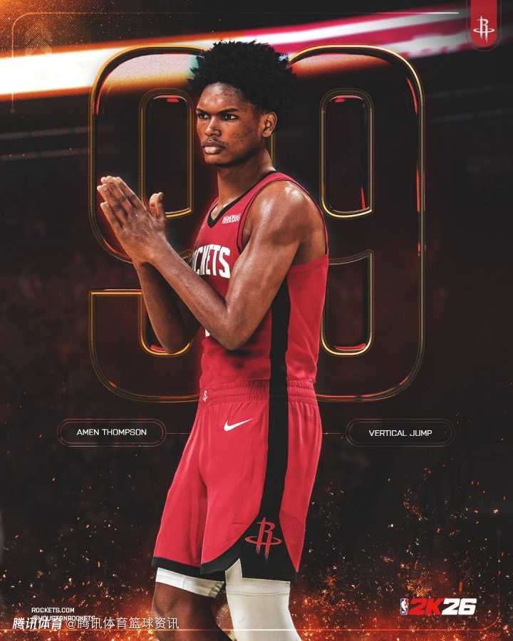 2025-09-06 09:10北京时间9月6日,火箭官方社媒更新动态,晒出一张海报聚焦球队球员阿门-汤普森。在NBA 2K26游戏中,阿门-汤普森不仅以99的垂直弹跳能力值位居所有球员之首,更是全联盟唯一一位在该能力项上拿到满分的球员。