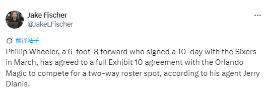 2025-09-06 10:00北京时间9月6题,据The Stein Line记者Jake Fischer报道,魔术队已与菲利普-惠勒签下一份 Exhibit 10训练营合同。