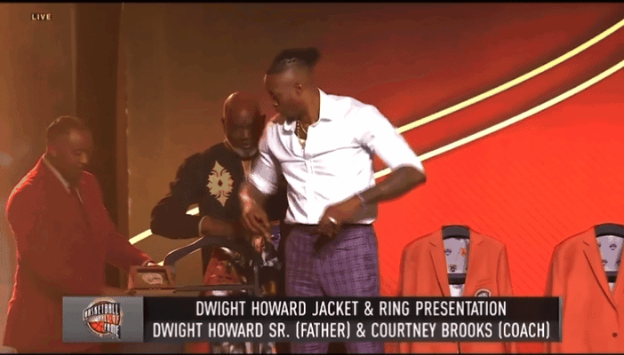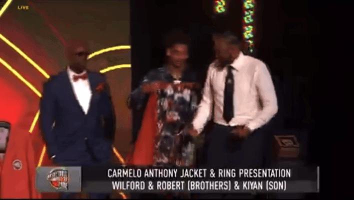 活动现场,甜瓜儿子基扬为父亲穿上名人堂夹克,而霍华德则是让自己的父亲给自己穿上名人堂夹克。据此前官方报道,甜瓜选择韦德、艾弗森作为自己入选名人堂的引荐人,而霍华德的名人堂引荐人则是有帕里什、罗德曼、尤因、威尔金斯和奥尼尔。