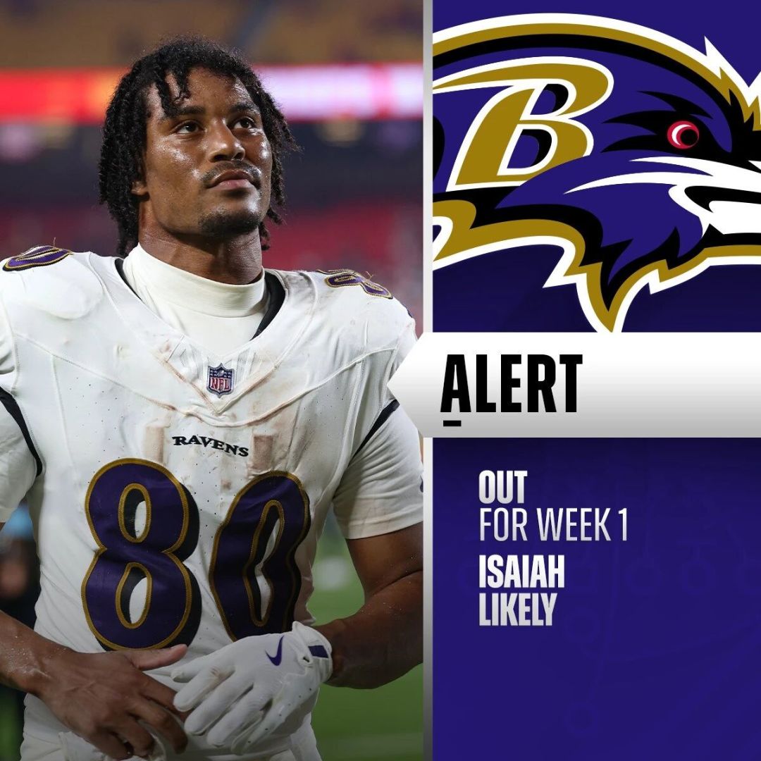乌鸦的接球型近端锋以赛亚-莱克利将缺战第一周对阵比尔的比赛,主力全卫帕特里克-里卡德也将缺席。比尔这边,老将角卫特雷达柳斯-怀特被标为出战成疑,踢球手泰勒-巴斯被放入了伤病储备名单,比尔签下了马特-普拉特顶替他的先发位置。
