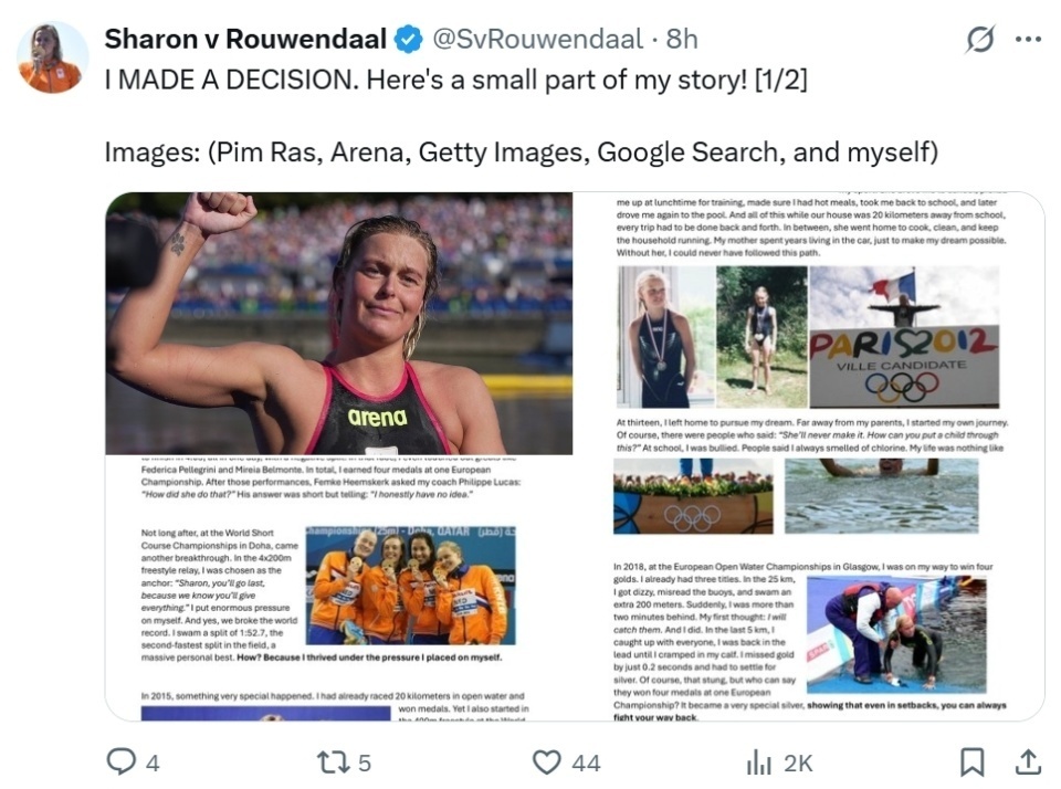罗文达尔发布的历程回顾里,讲述了自己从小就有成为奥运冠军的梦想、以及13岁就远离父母,赴专业队训练、17岁首次参加世锦赛,与伤病做斗争...21年东京奥运会拿到银牌之后,因为年龄和状态被质疑,直到24年多哈世锦赛2金以及巴黎拿到第二枚奥运金牌,再度证明自己是最优秀的整个历程。