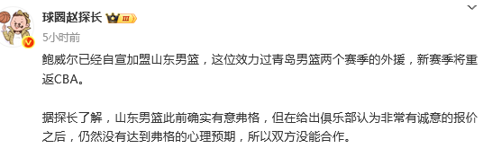 2025-09-06 15:20北京时间9月6日,根据媒体人赵探长的报道:“鲍威尔已经自宣加盟山东男篮,这位效力过青岛男篮两个赛季的外援,新赛季将重返CBA。