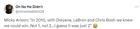 “2010年,当队中拥有德维恩-韦德、勒布朗-詹姆斯和克里斯-波什时,我们就知道球队有能力夺冠。当时我们曾说要拿1个、2个……现在看来,我们最终拿了2个冠军。”