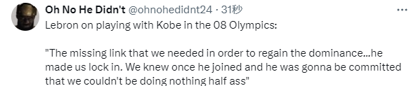 湖人队球员詹姆斯在谈到2008年与科比并肩作战的经历时表示:“他是我们重新夺回霸主地位所必需的关键一环……是他让我们全神贯注。我们知道,一旦他加入队伍,并且全身心投入,我们就绝不能再敷衍了事、半途而废。”