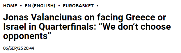 瓦兰丘纳斯着重强调了团队协作的重要性。“我们始终秉持团队作战的理念。无论谁来投篮、谁来主导进攻,我们都会团结在一起、互相支持。这就是我们球队的特质。” 立陶宛队将在四分之一决赛中对阵希腊队与以色列队之间的胜者。“我们没有偏好,也不会挑选对手。他们会各自出战,我们只需等待晋级结果。之后我们会进行比赛分析,做好备战工作。” 拉脱维亚队的波尔津吉斯此役表现出色,但仍未能带领球队击败立陶宛。对此,瓦兰丘纳斯表示:“他是一位非常出色的球员,也多次证明了这一点。但我们在比赛的每一个时刻都全力以赴,最终成功赢下了比赛。” 对于自己本场不足10分钟的上场时间,瓦兰丘纳斯也做出了回应。“这得问教练,我来到这里,无论是上场打球还是在场边助威都没问题。我热爱我的队友们,无论我在场上还是场下,都会支持他们。就像我多次说过的,篮球是一项团队运动,我们彼此都需要对方。” 在瓦兰丘纳斯看来,赢下这场波罗的海德比战,并没有让胜利变得“更特别”。“每一场胜利都很甜蜜,每一场失利都令人苦涩。我们只会关注眼前的对手,做好准备,战斗到最后一刻。”