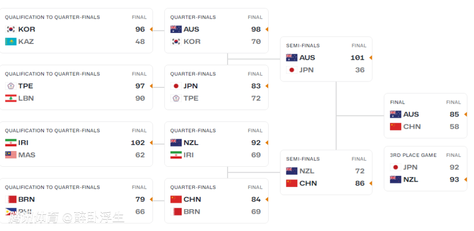 中国队本届赛事前5场比赛表现出色,豪取5连胜时隔8年晋级决赛,且前5场比赛合计狂胜159分。只是决赛面对实力强大的澳大利亚队,中国队在上半场只落后1分顽强抵抗,但下半场逐步崩盘被拉开差距,最终58-85输球获得队史第2次亚军。