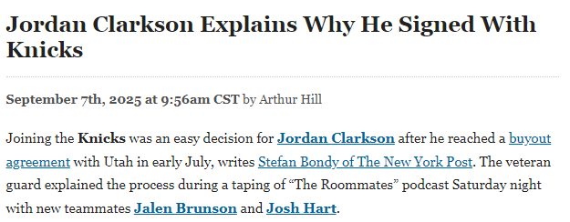 2025-09-08 06:30北京时间9月8日,据尼克斯队记Stefan Bondy报道,在7月初与爵士队达成买断协议后,克拉克森加盟纽约尼克斯队的决定并不复杂。这位后卫在近期与新队友布伦森、哈特共同录制The Roommates播客时,详细讲述了加盟背后的过程。