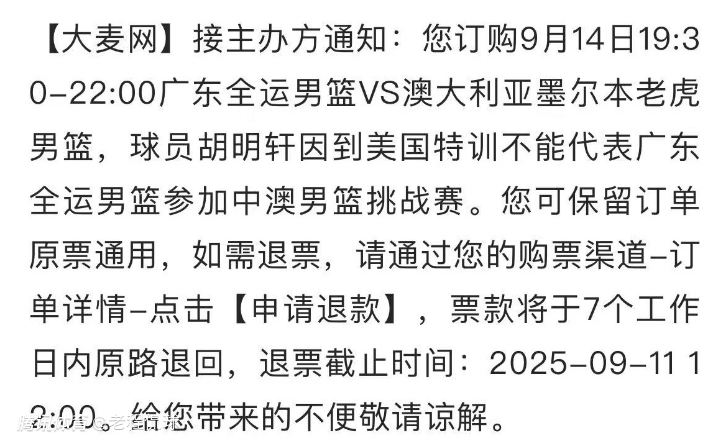 根据某球票网站的最新信息,胡明轩因为要到美国特训,所以无法代表广东全运会男篮参加和澳大利亚墨尔本老虎队的比赛。为此,购买了本场比赛球票的球迷,如果需要退票,可以办理退票。