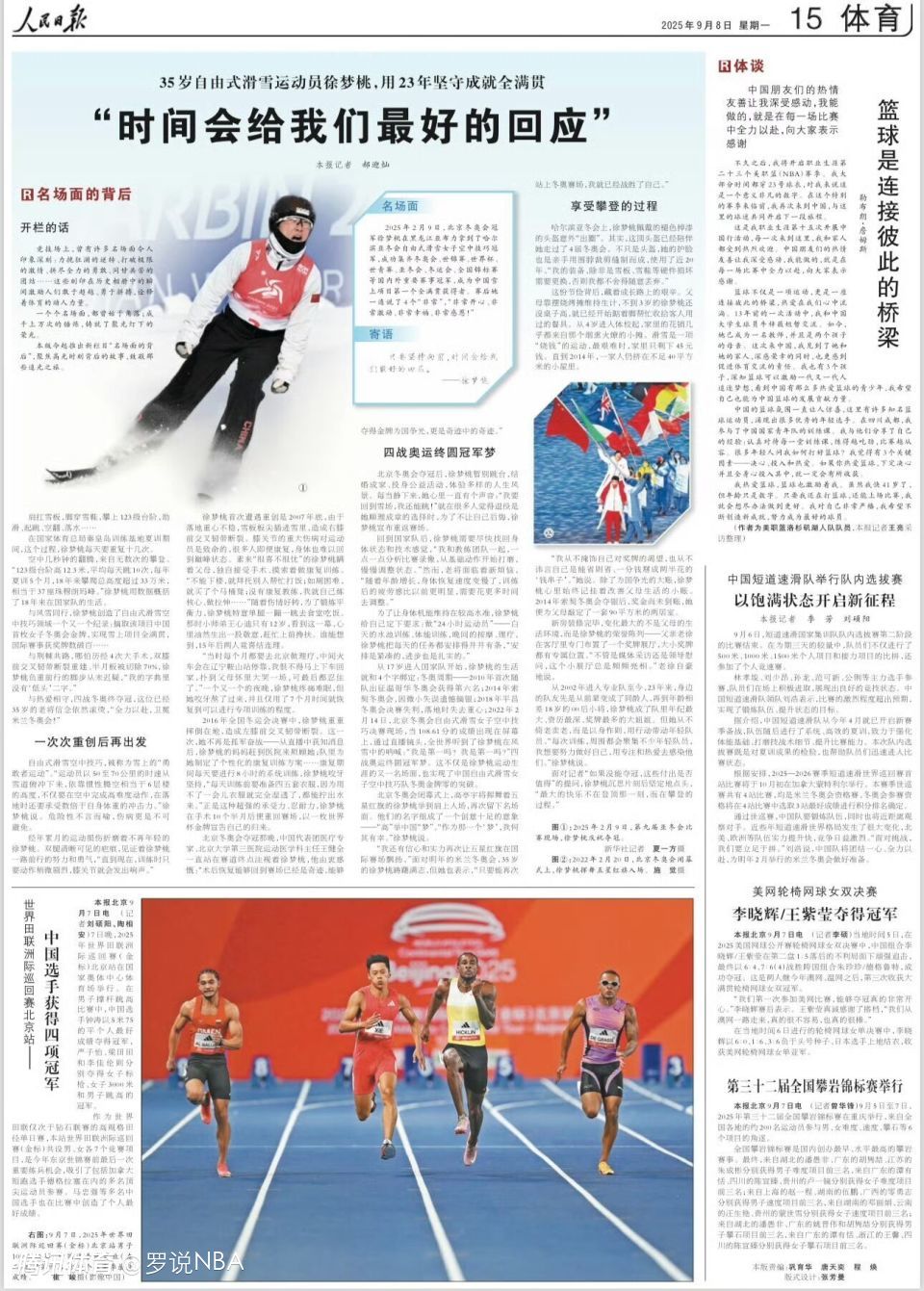 2025-09-08 10:50北京时间9月8日,湖人球星勒布朗-詹姆斯登上了《人民日报》。在今日发表的《人民日报》第15版体育板块,刊登了詹姆斯的采访。