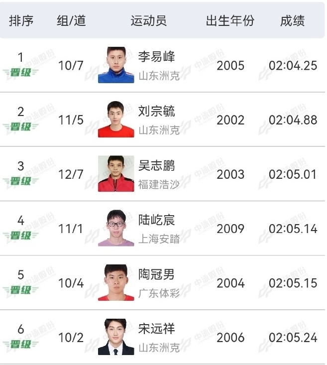 2025-09-08 14:10在刚刚结束的2025全国游泳锦标赛男子200米混合泳预赛里,来自山东的李易峰以2分04秒25排在第一。山东选手刘宗毓以2分04秒88排在第二,福建选手吴志鹏位列第三。