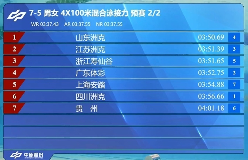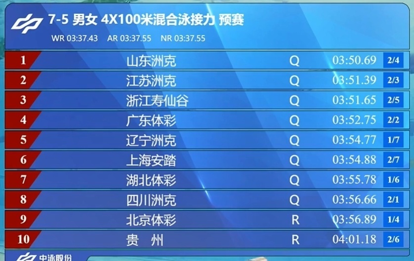 全锦赛男女4X100混合泳接力:山东力压江苏领跑预赛,浙江排第三