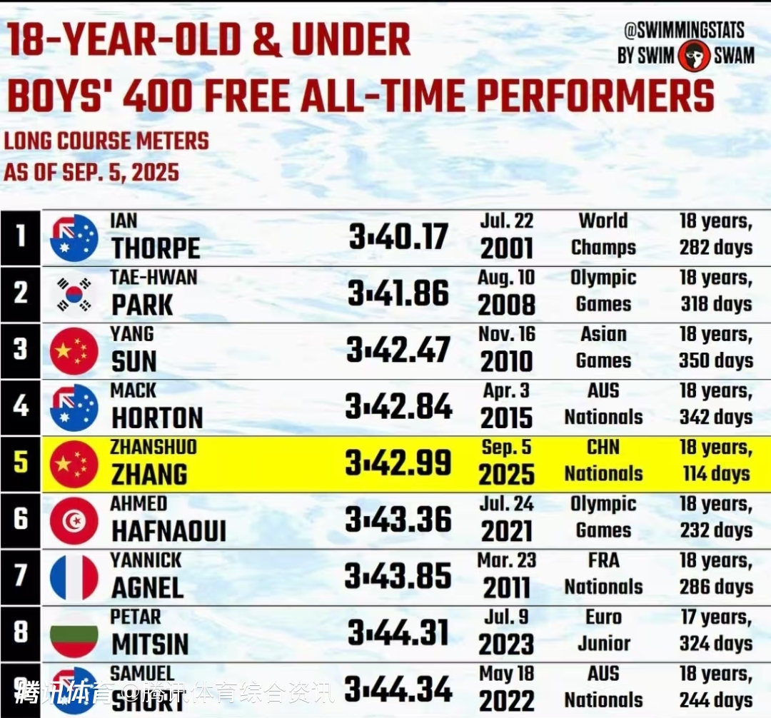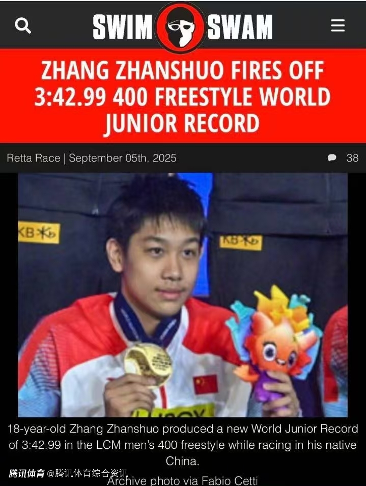 Swimswam撰文称,这位新星正以持续进击的姿态,成为中国游泳队新一代领军人物。文章还提及,张展硕3分42秒99的成绩,在男子400自18岁及以下年龄组中位列历史第五,而排名前四的选手均是奥运冠军。