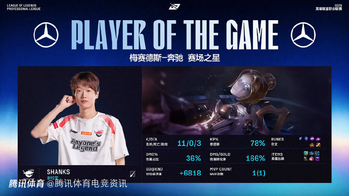第15分钟,Tarzan波比支援上路,Flandre赛恩击败格温拿下一血;第19分钟,野区爆发冲突,AL打出零换二后控下小龙;第24分钟,野区WBG先手击败AL两人,后续拉扯中Shanks奥莉安娜收割残局斩获双杀,双方打出四换四后AL控下大龙;第27分钟,上路WBG先手进攻,但AL拉扯出色,Shanks奥莉安娜拿下三杀,AL团灭WBG后推平基地赢下比赛。