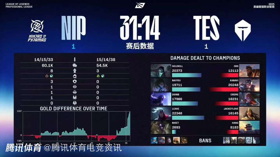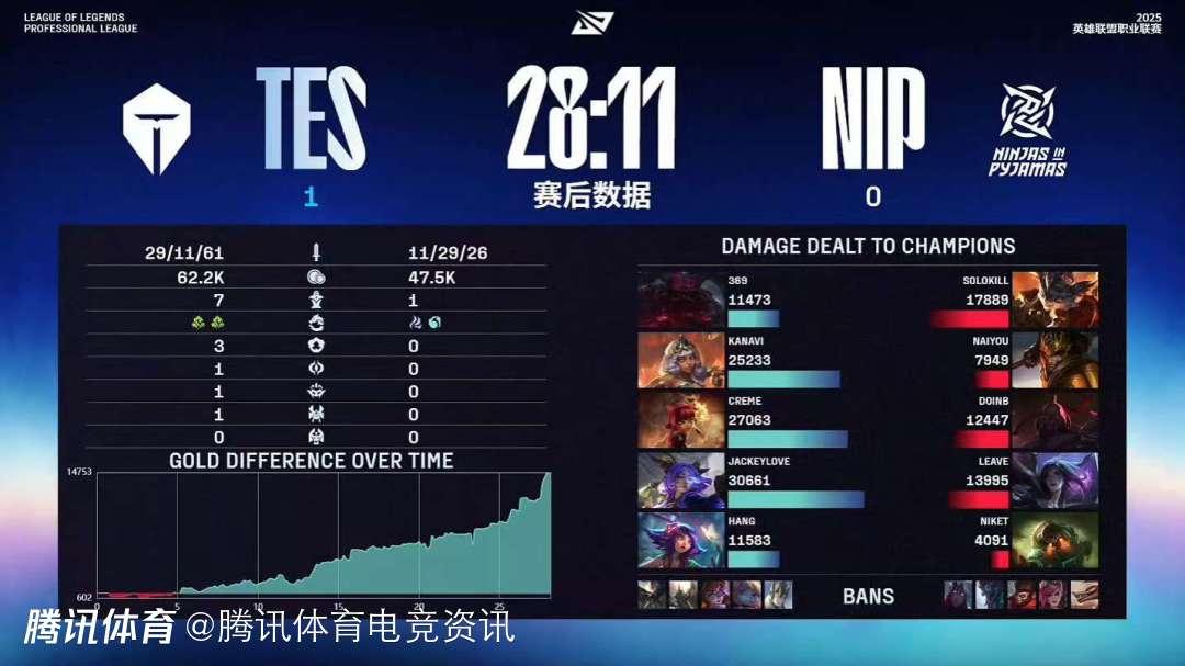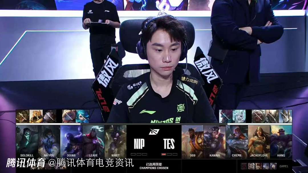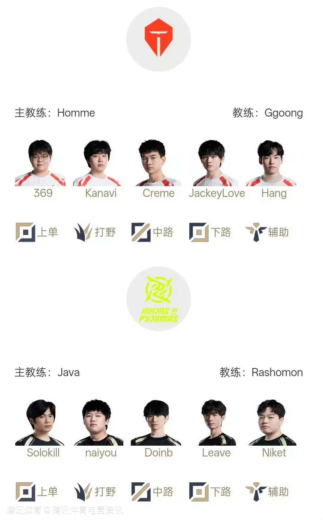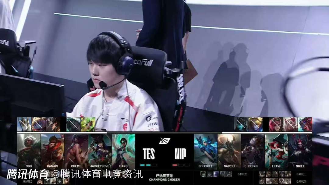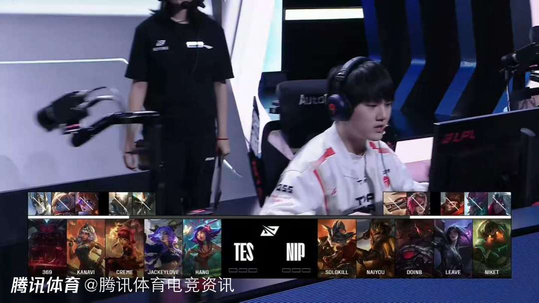 双方首发阵容为:TES (369、Kanavi、Creme、JackeyLove、Hang) NIP(Solokill、naiyou、Doinb、Leave、Niket)