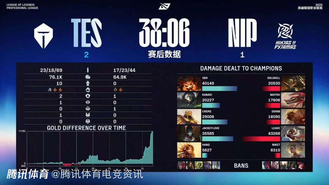 比赛第10分钟,小龙争夺,Leave库奇击败斯卡纳拿下一血,NIP打出一换三。第16分钟,峡谷先锋爆发团战,Kanavi斯卡纳大招控住两人,369纳尔拉扯拿下双杀,TES最终打出四换五。第21分钟,TES野区先手开团,Niket芮尔反手控住TES多人,naiyou纳亚菲利拿下双杀,NIP打出二换四后控下厄塔汗。第35分钟,Doinb塔莉垭开团纳尔,在拉扯中野辅被秒,TES成功0换2随后控下大龙。第37分钟,JackeyLove烬持续输出斩获四杀,TES团灭NIP后一波赢下比赛。