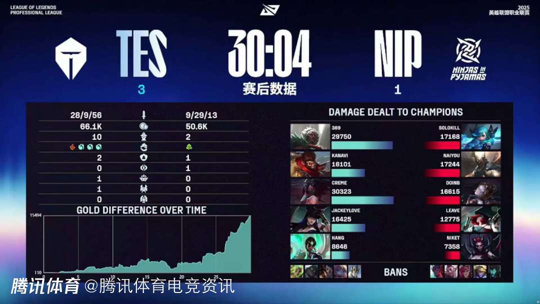 比赛开局仅1分钟,Leave卡莎配合队友在河道击败奇亚娜,拿下一血。第15分钟,TES在巢虫处逼团,先手击败嘉文四世,后续Creme安妮拿下双杀,TES拉扯出色打出二换四。第25分钟,野区Hang妮蔻大招控住NIP三人,JackeyLove芸阿娜和Creme安妮分别拿下双杀,TES打出一换四后控下大龙。第27分钟,TES带着大龙BUFF持续推进,369奥恩拿下双杀,TES团灭NIP后推平基地赢下比赛。