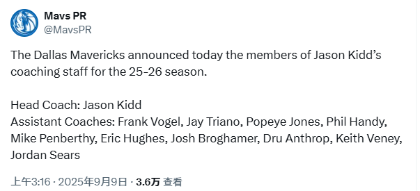 2025-09-09 05:50北京时间9月9日,达拉斯独行侠队的球员阵容很豪华,如今他们已通过官方正式确认了2025-26赛季主教练杰森-基德的教练组名单,同样是阵容豪华。