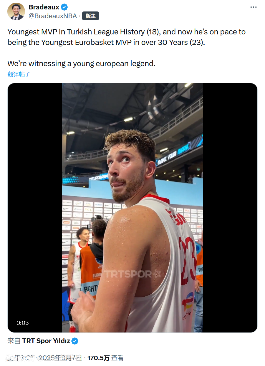 正因此,外界都在呼吁申京冲击今年欧洲杯的MVP。火箭记者Bradeaux发推,谈到了本届欧锦赛申京的表现:“他是土耳其联赛历史上最年轻的MVP(18岁),现在他有望成为30多年来最年轻的欧洲杯MVP(23岁),我们正在见证一位年轻的欧洲传奇。”