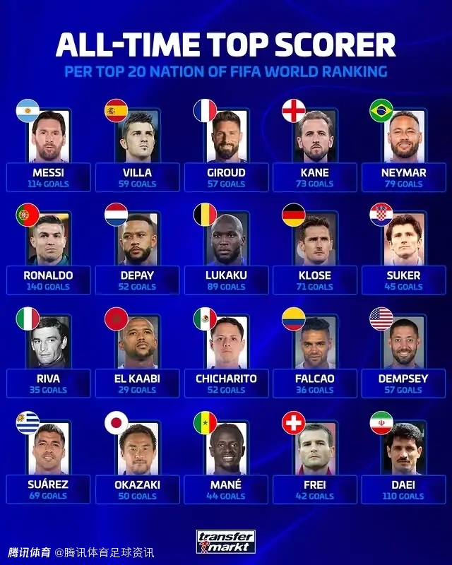 德转统计FIFA排名前20国家队射手王:C罗140球居首 梅西114球次席