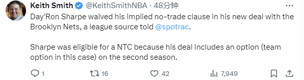 该专家在个人推特上写道:“一位联盟消息人士透露,夏普在与布鲁克林篮网队签订的新合同中,放弃了其隐含的交易否决权。夏普之所以有资格获得交易否决权,是因为他的这份合同包含了第二个赛季的球队选项。”