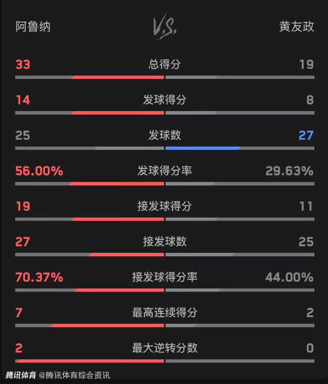 首局比赛,双方开局战成2平,但阿鲁纳随后开启进攻模式,黄友政以2-9落后,陷入绝对的被动局势,最终黄友政以3-11丢掉了首局。