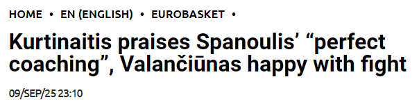 库蒂纳蒂斯说道:“首先,我要祝贺希腊队打出了一场精彩的比赛,也由衷祝贺斯潘诺里斯的出色执教。今晚的希腊队比我们更强。我们拼尽了全力,我不会质疑我的球员们,因为我们今晚的实力就是如此,还不够强,不足以赢下这场比赛。” 他特别强调了雅库拜蒂斯伤退后,球队在控球后卫位置上的人员短缺问题。“我们最大的问题是,球队没有真正的组织核心。自雅库拜蒂斯受伤后,整个欧洲杯期间我们一直在讨论这个问题。这也是我们今晚失利的关键。在这样级别的比赛中,你需要能带动队友、让队友变得更出色的球员。让我们拭目以待四强赛的战况吧。”