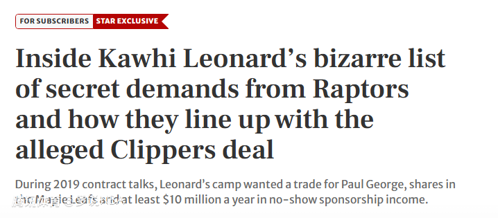 阿瑟在报道中写道:“就在那时,猛龙队才意识到,莱昂纳德并非希望被引荐给多伦多利润丰厚的企业圈——对方实际是在要求安排‘挂名岗位’,以及促成‘无需投入的投资’。最终猛龙队拒绝了这两项提议。”