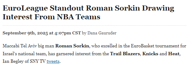 2025-09-10 06:30北京时间9月10日,据记者Ian Begley报道,特拉维夫马卡比队的内线球员罗曼-索尔金已引起开拓者、尼克斯和热火三支NBA球队的兴趣。索尔金此前在男篮欧洲杯中代表以色列国家队有着出色表现。