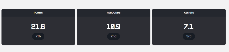 数据方面,申京目前场均21.6分10.9篮板7.1助攻,投篮命中率59.6%,三分命中率37.5%。他的场均得分排名杯赛第7,场均篮板排名杯赛第2,场均助攻位居杯赛第3。值得一提的是,