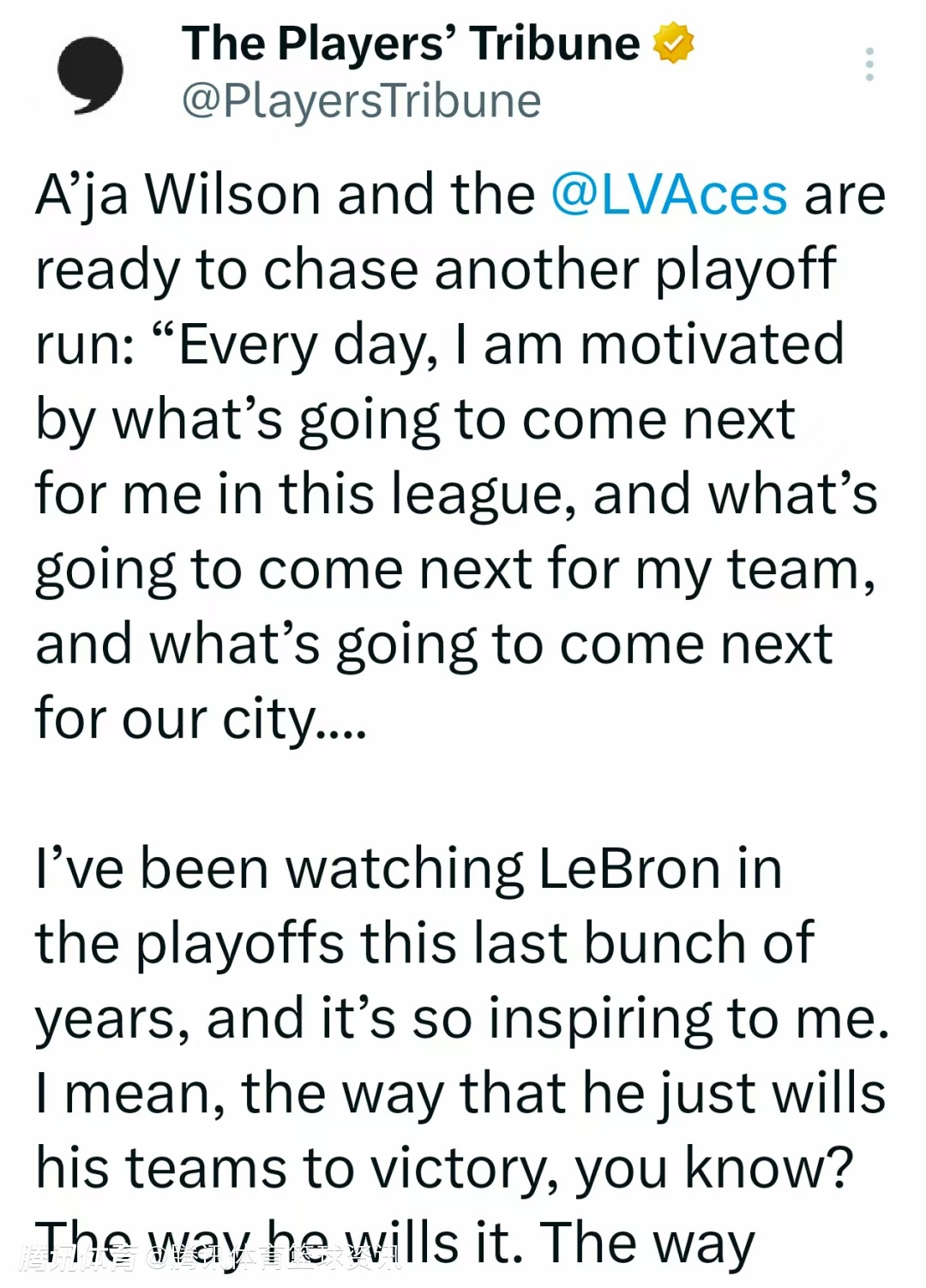 阿贾-威尔逊:詹姆斯表现对我启发极大 特别是那种一心求胜的意志