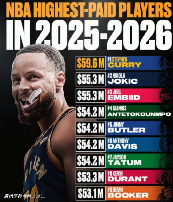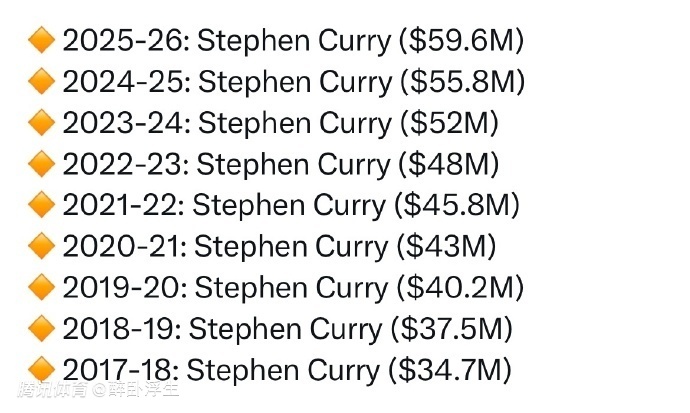 库里依然是NBA的薪水王,他从2017-18赛季开始,到新赛季将连续9个赛季,成为NBA薪水第一多的球员,也是继续创造历史纪录,库里也是接近达到6000万美元的年薪。此外,库里此前还在采访中认为自己的“薪水”低了,原因是没有参与球队分成。