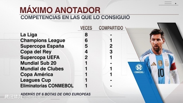 这也是梅西职业生涯第30次拿到最佳射手,其中包括西甲(8次)、欧冠(6次)、西班牙超级杯(5次)、国王杯(4次)、欧洲超级杯(2次)、世青赛(1次)、世俱杯(1次)、美洲杯(1次)、北美联赛杯(1次)、南美世预赛(1次)以及6次欧洲金靴奖。