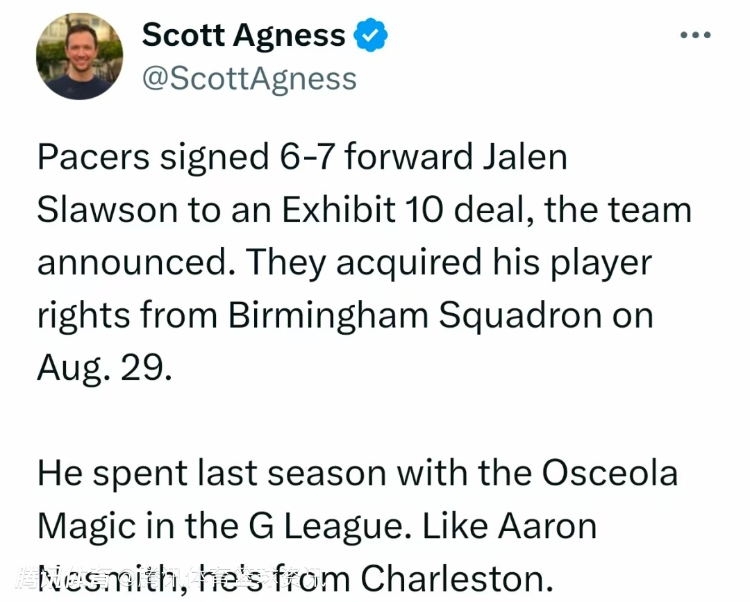 2025-09-10 11:00北京时间9月10日,据步行者队记Scott Agness报道,步行者队已与前锋贾伦-斯劳森签下一份Exhibit 10合同。早在8月29日,步行者就从伯明翰中队手中获得了斯劳森的G联盟签约权。