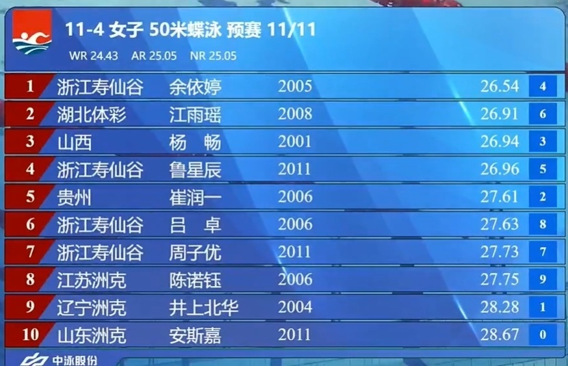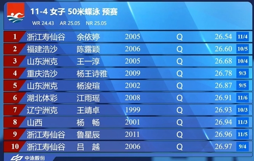 余依婷报名成绩最好,为25秒73;十几分钟前刚比完200米仰泳预赛的鲁星辰又出场,成绩是26秒39。