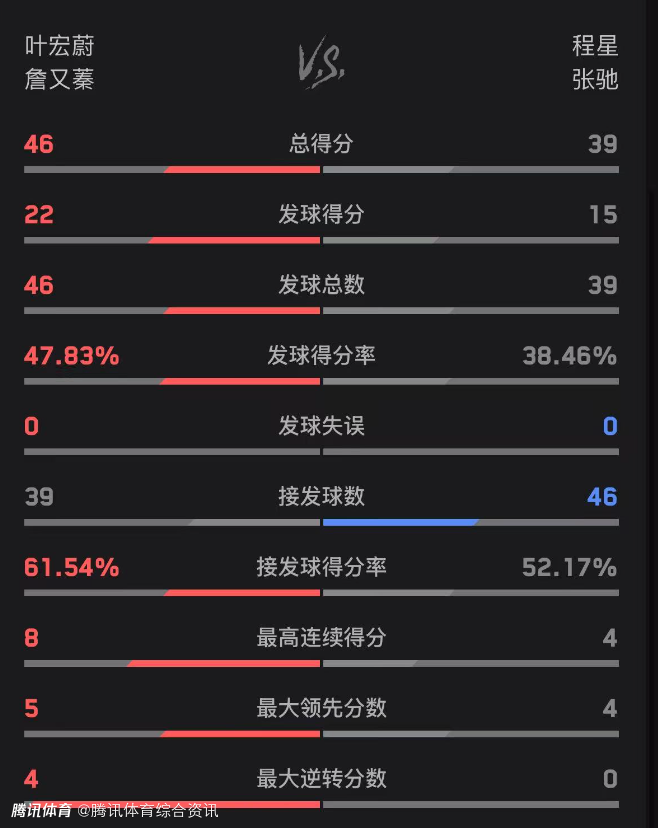 双方技术统计如下(星驰组合在前):总得分39-46、发球得分15-22、发球得分率38.46%-47.83%。