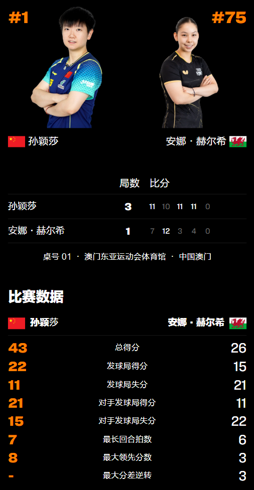 孙颖莎3-1赫西(威尔士)。
