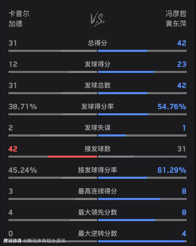 双方技术统计如下(凤凰组合在前):总得分42-31、发球得分23-12、发球得分率54.76%-38.71%。