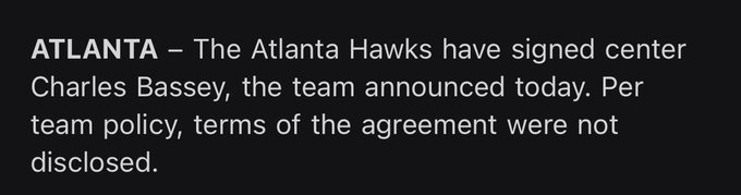 2025-09-11 07:00北京时间9月11日,老鹰队官方发布公告,宣布球队正式签下内线球员查尔斯-巴塞。据联盟消息人士透露,这份合同为非保障的Exhibit 10条款合同。