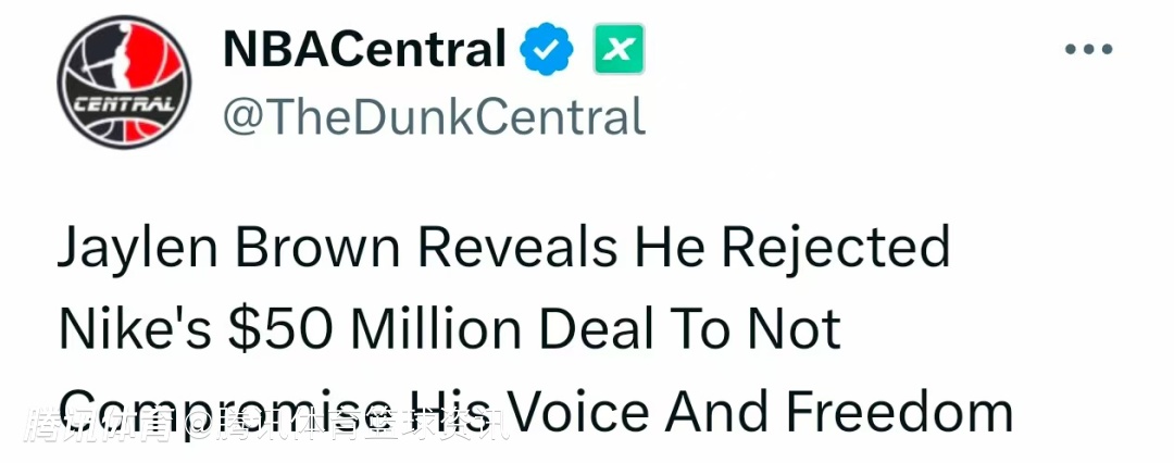 2025-09-11 08:00北京时间9月11日,凯尔特人队球星杰伦-布朗在播客节目中透露,自己曾拒绝耐克提供的一份价值5000万美元的球鞋代言合同。