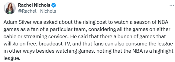 谈到NBA比赛流媒体观看成本上涨,萧华表示:我们有大量内容,基本上人们可以免费获取,这项运动非常依赖精彩瞬间,那些付不起流媒体服务的球迷依然可以观看免费的比赛精彩片段。