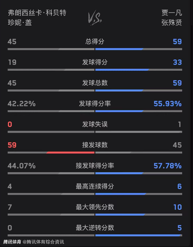 双方技术统计如下(贾一凡/张殊贤在前):总得分59-45、发球得分33-19、发球得分率55.93%-42.22%。