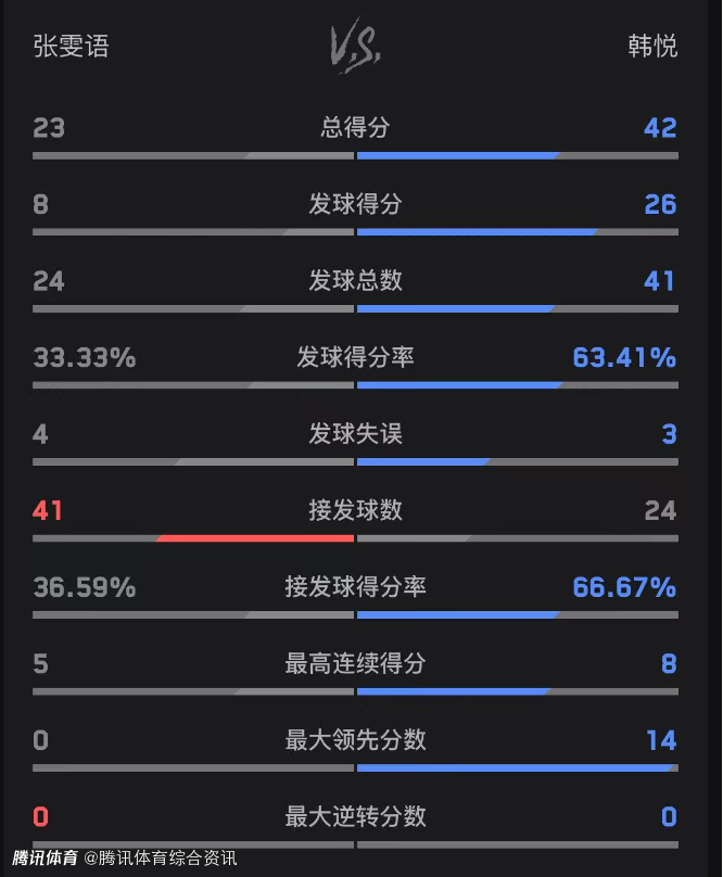 双方技术统计如下(韩悦在前):总得分42-23、发球得分26-8、发球得分率63.41%-33.33%。