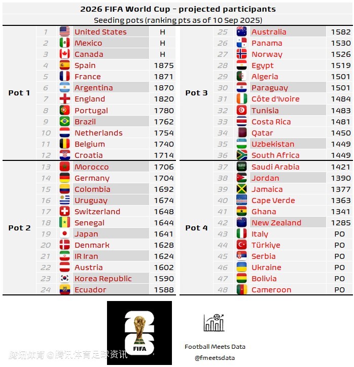 2026世界杯预测分档(基于9月FIFA积分 & 模拟晋级结果)