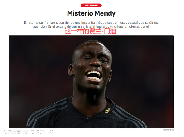 按照皇马医疗组的预测,费兰-门迪将在7月中旬复出。不过,法国边卫仍然没有回归。新赛季西甲踢了3轮,门迪依然无法与全队合练,只能单独在健身房或者独自训练,还在养伤的状态中。《阿斯报》表示,门迪的伤情充满悬疑,没人说得清。