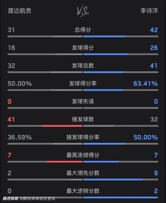 双方技术统计如下(李诗沣在前):总得分42-31、发球得分26-16、发球得分率63.41%-50%。