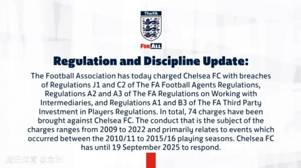 在官方公告中,英足总表示:“英足总正式对切尔西俱乐部发出指控。切尔西一共违反了74项指控,涉及2009年-2022年之间的违规行为,且主要集中在2010-2016年。9月19日之前,切尔西俱乐部需要对此作出回应。”