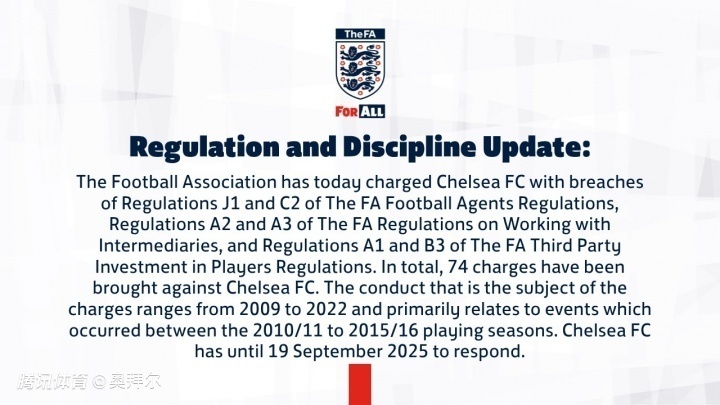 在公告中,英足总表示,“英格兰足球总会今日对切尔西足球俱乐部提出指控,其违反《英足总足球经纪人条例》J1和C2条款、《英足总中介合作条例》A2和A3条款,以及《英足总第三方球员投资条例》A1和B3条款。切尔西俱乐部共面临74项指控,涉及2009年至2022年期间的违规行为,主要集中于2010/11至2015/16赛季期间。切尔西俱乐部需于2025年9月19日前就此作出回应。”
