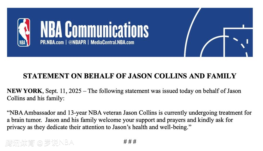 2025-09-12 04:50北京时间9月12日,据NBA官方发布的声明,曾在NBA效力13年的中锋杰森-科林斯的家人于今日宣布,科林斯目前正在接受脑瘤治疗。