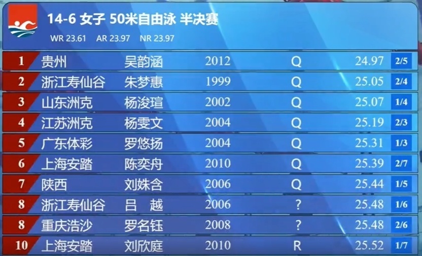 预赛里,浙江老将朱梦慧以25秒11技压群芳!山东名将杨浚瑄以25秒17排在第二,贵州选手吴韵涵以25秒21位列第三。
