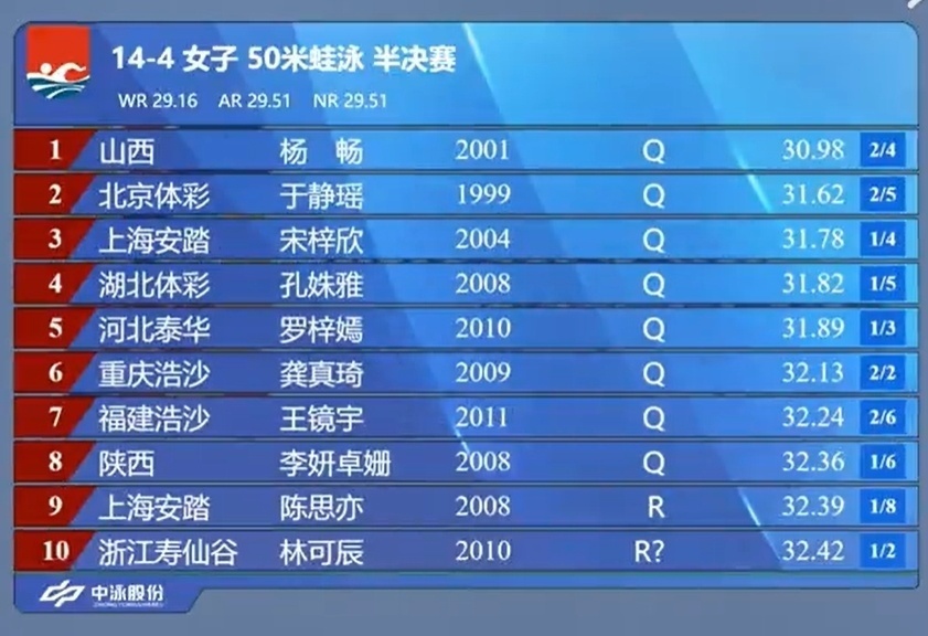 预赛里,山西老将杨畅以31秒47排在第一;上海选手宋梓欣位列第二;来自北京的老将于静瑶以31秒89排名第三。